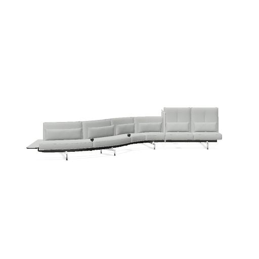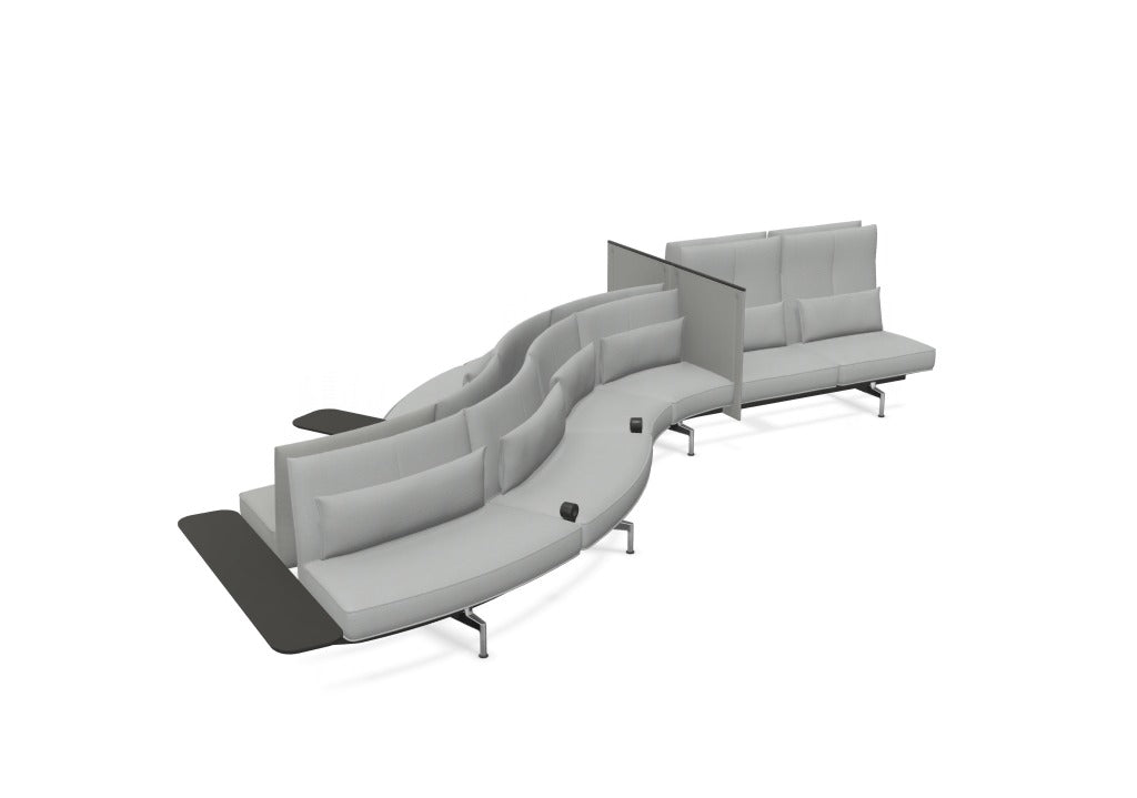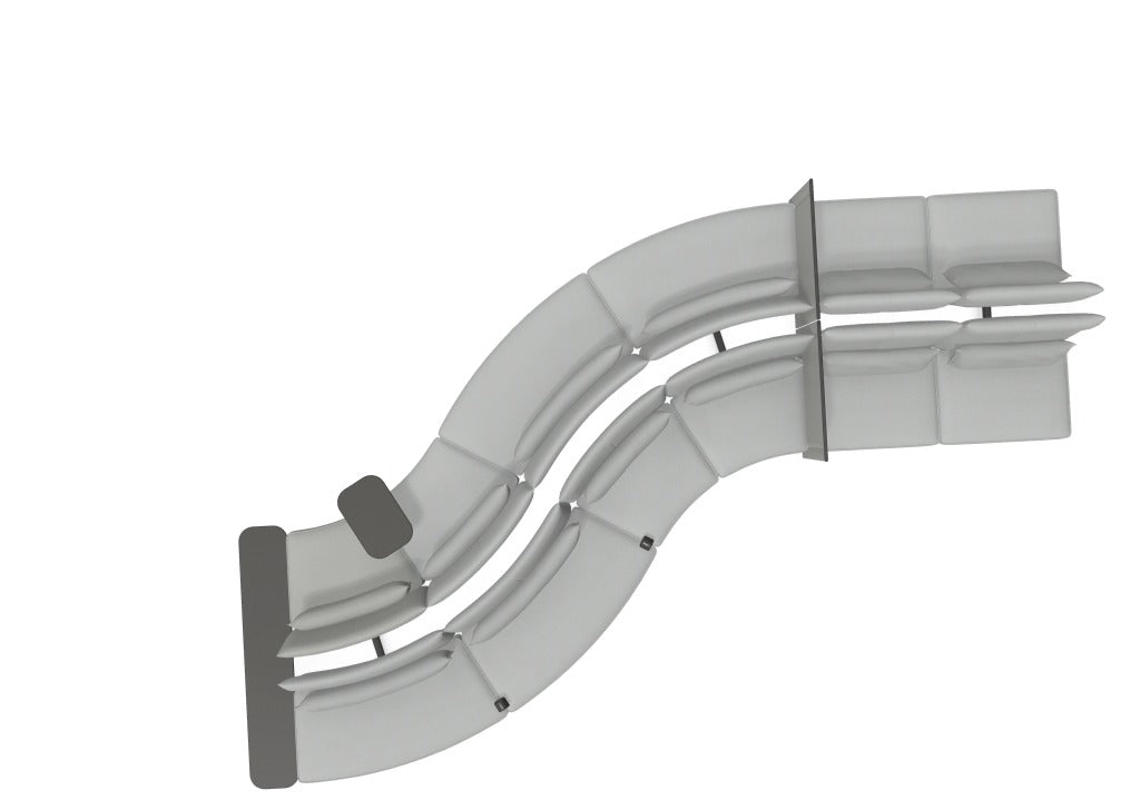 Total number of modules: 12 Total number of seats: 12 Setup: 12x seat / back (with 8x curved seat / back) Configuration type: curved combination Overall measurement: 5.82 x 2.62 x 1.13 m Cover materials & colors: Credo cream/dolphin, Plano cream white/sierra grey Base colors: die-cast aluminium, polished